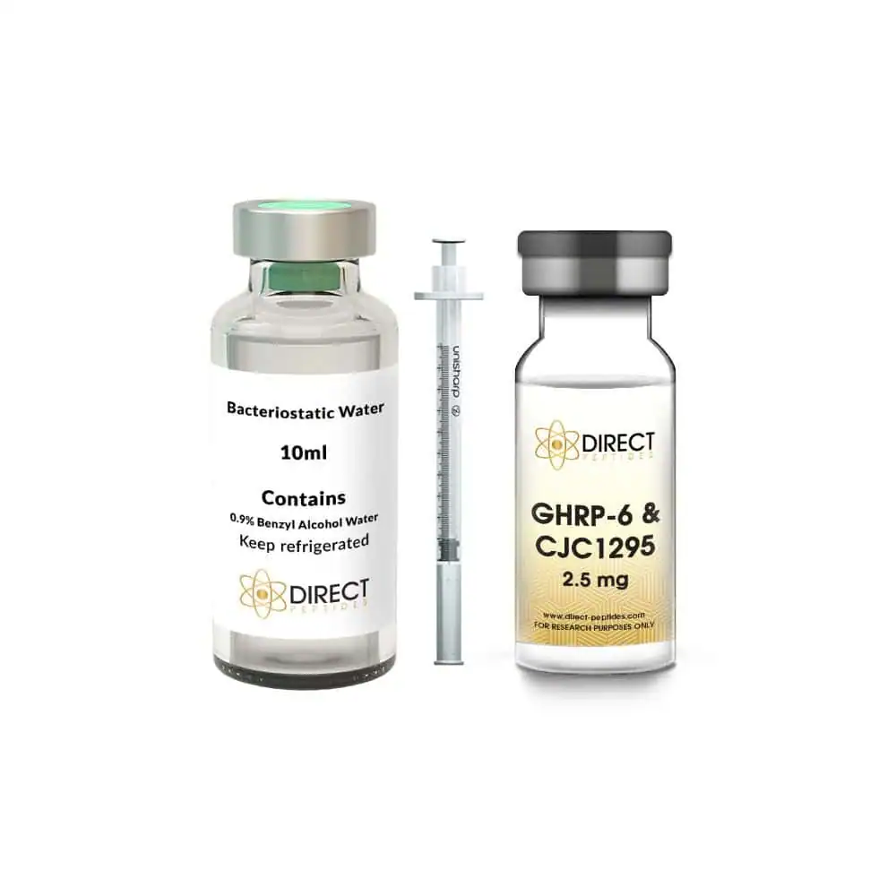 Buy GHRP-6 CJC-1295 DAC Blend Peptide Vial (2.5mg), a synergistic combination of two potent peptides, designed to enhance growth hormone release and promote overall anabolic effects.